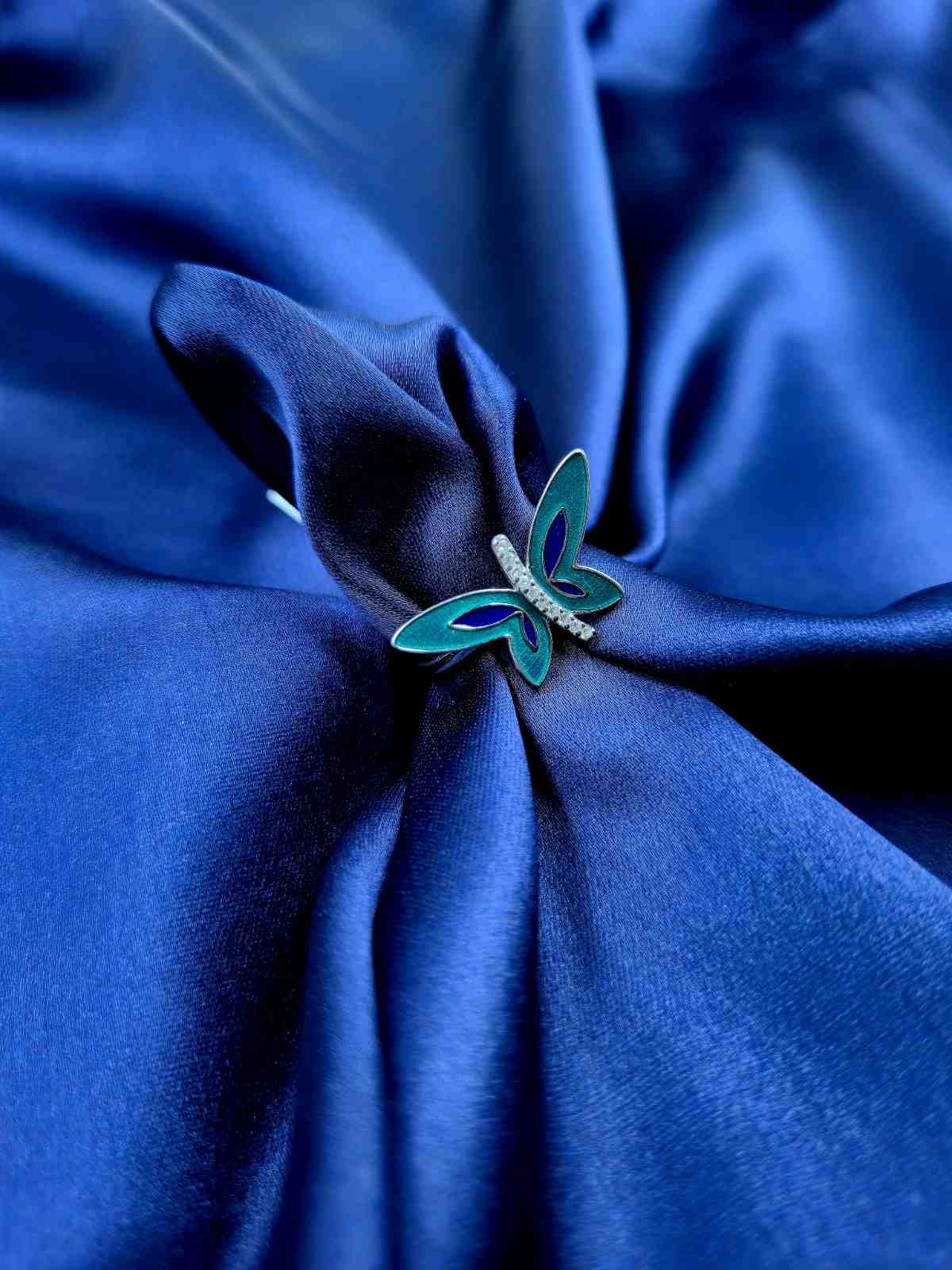 925 Silver Ring with teal colour butterfly and zarkan inside.