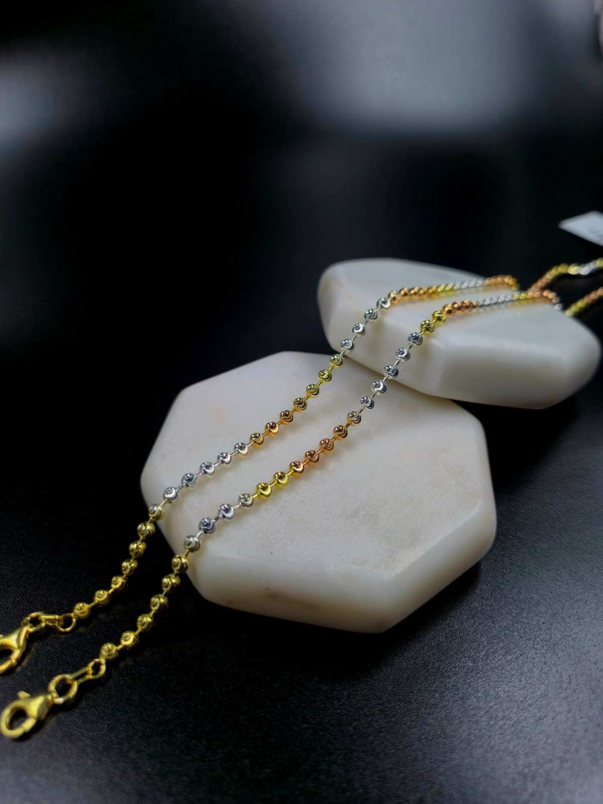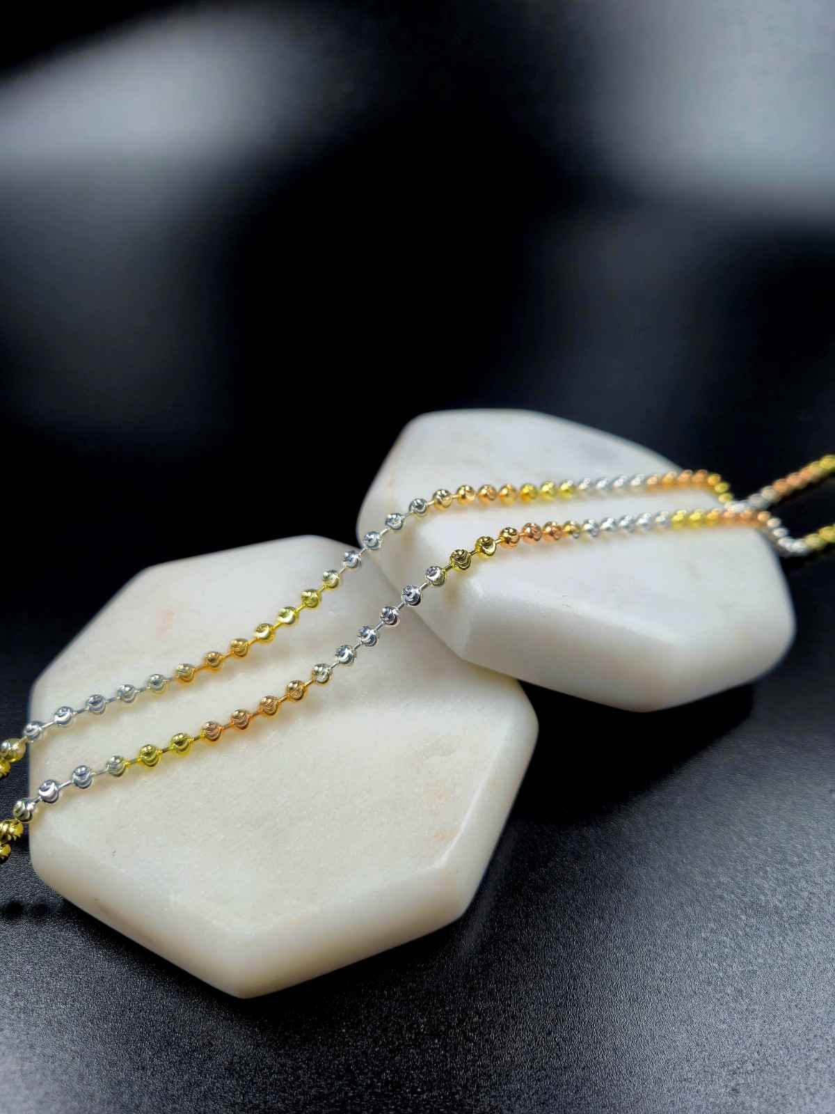 925 Silver anklet with tiny silver ball chain coloured in rose gold, gold and silver colour.
